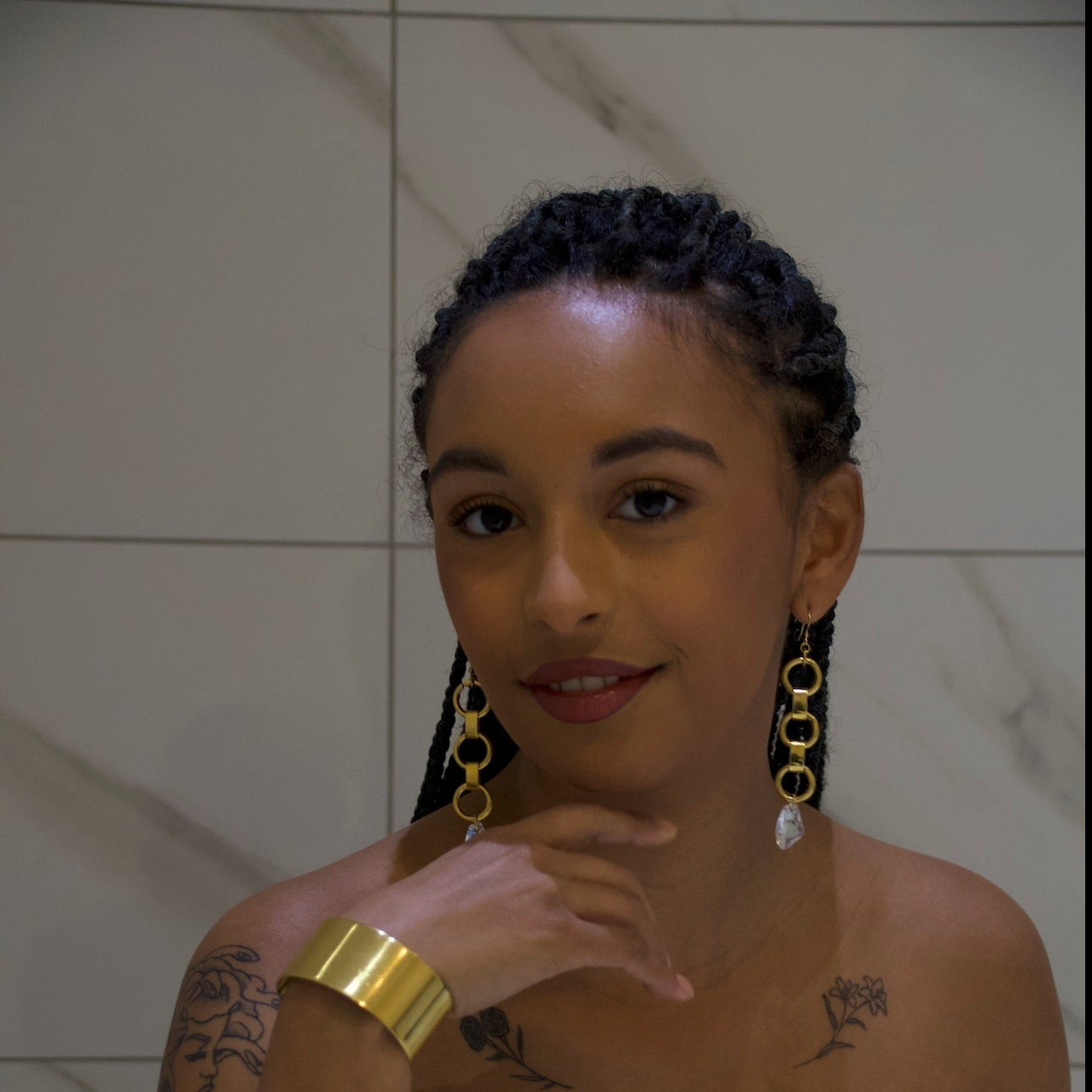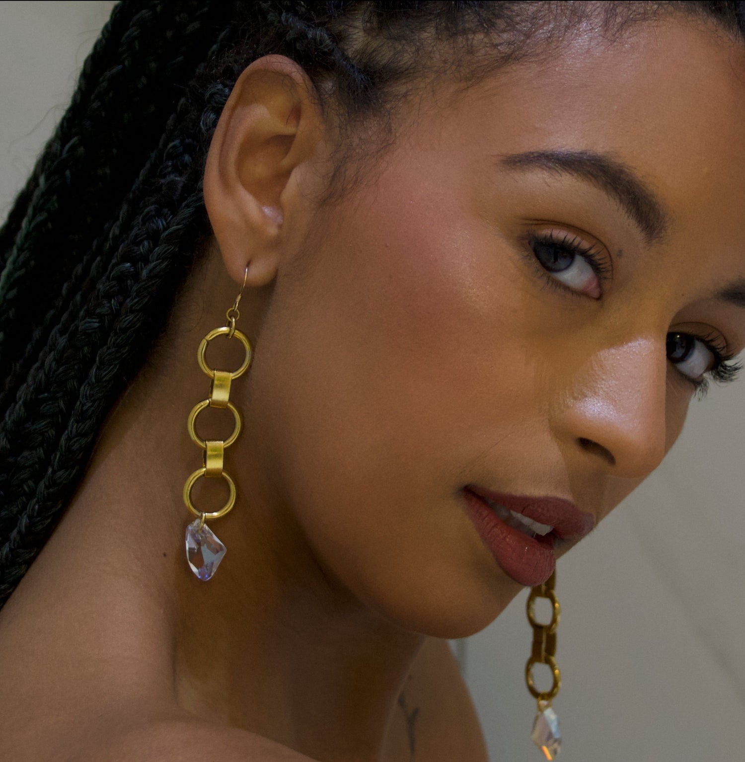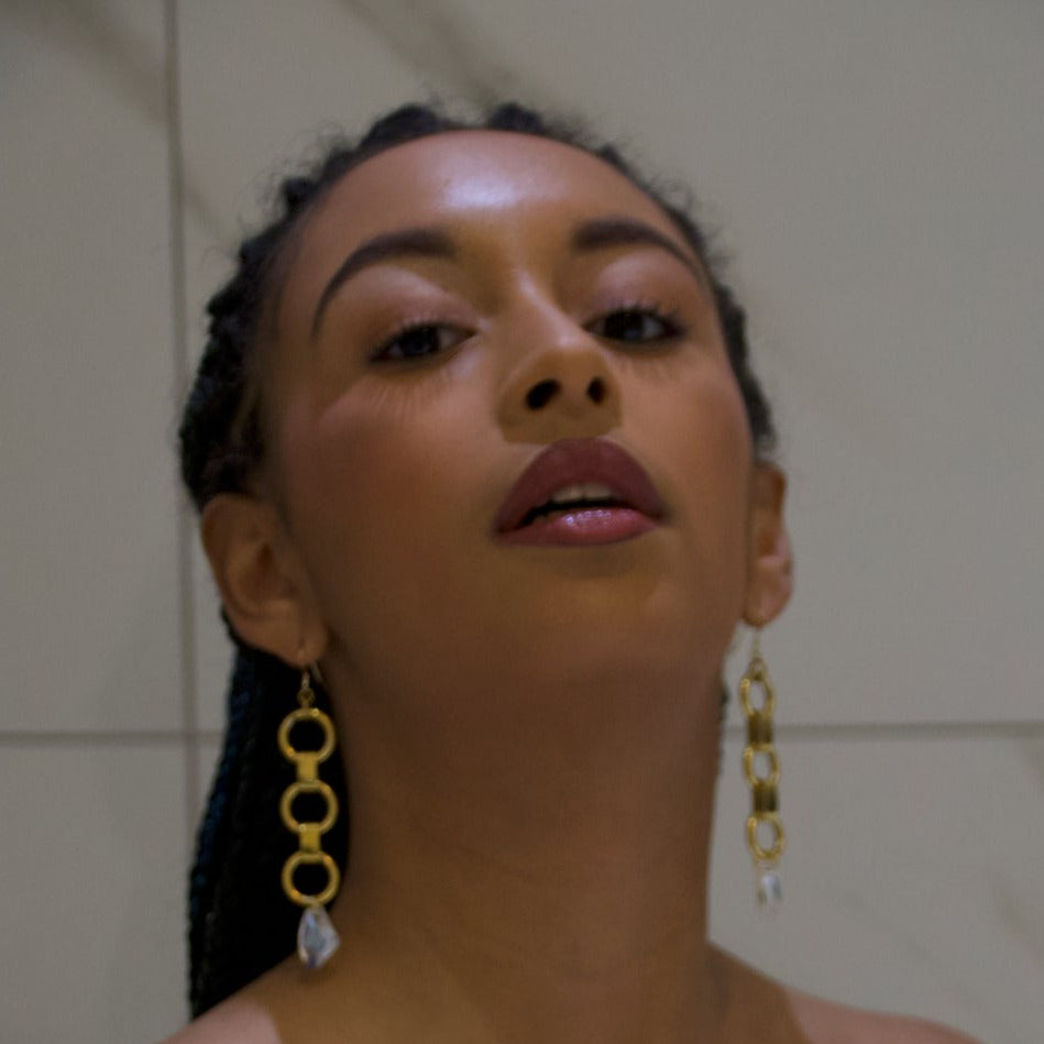 Elevate your look with these stunning Arlene Shoulder Dusters. Crafted with our signature loop chain and featuring asymmetrical Swarovski drops. These elegant earrings are perfect for a sophisticated, luxurious finish. You'll feel like a goddess with these show stopping earrings. Pictured with our Arma Cuff.